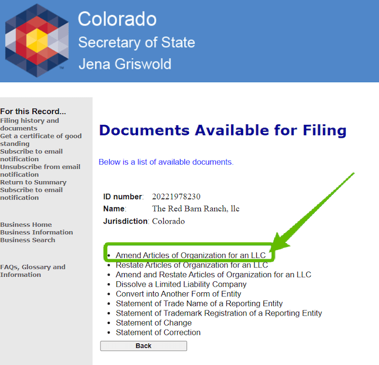 Note: The Colorado Secretary of State is responsible for LLC formation and administration, including name changes.