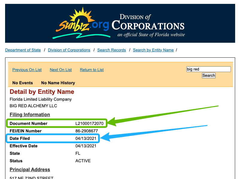 For the next two items, you’ll need to look up your LLC’s record on the Florida Business Entity Search.