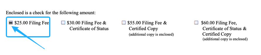 Check the box for the filing fee amount you’re paying. If you aren’t adding any extra services, check the first box for the $25 Articles of Amendment Fee.