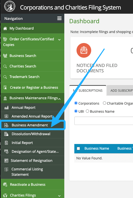 Under the heading Business Maintenance Filings, click Business Amendment.