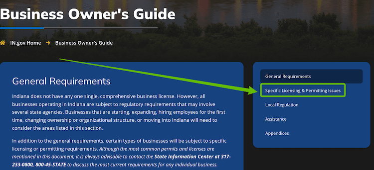 Alternately, Indiana has a state information center (317-233-0800) that can advise you about current requirements for business licenses.