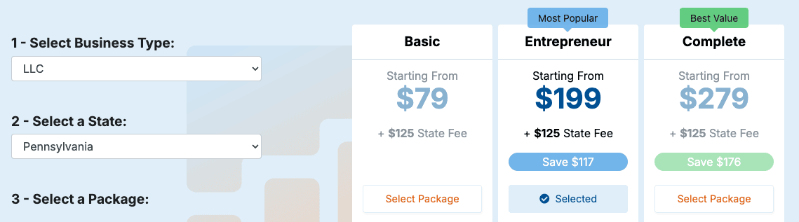MyCompanyWorks’ intermediate package is its Entrepreneur Package. This package costs $199 plus state fees and includes everything in the Basic Package.