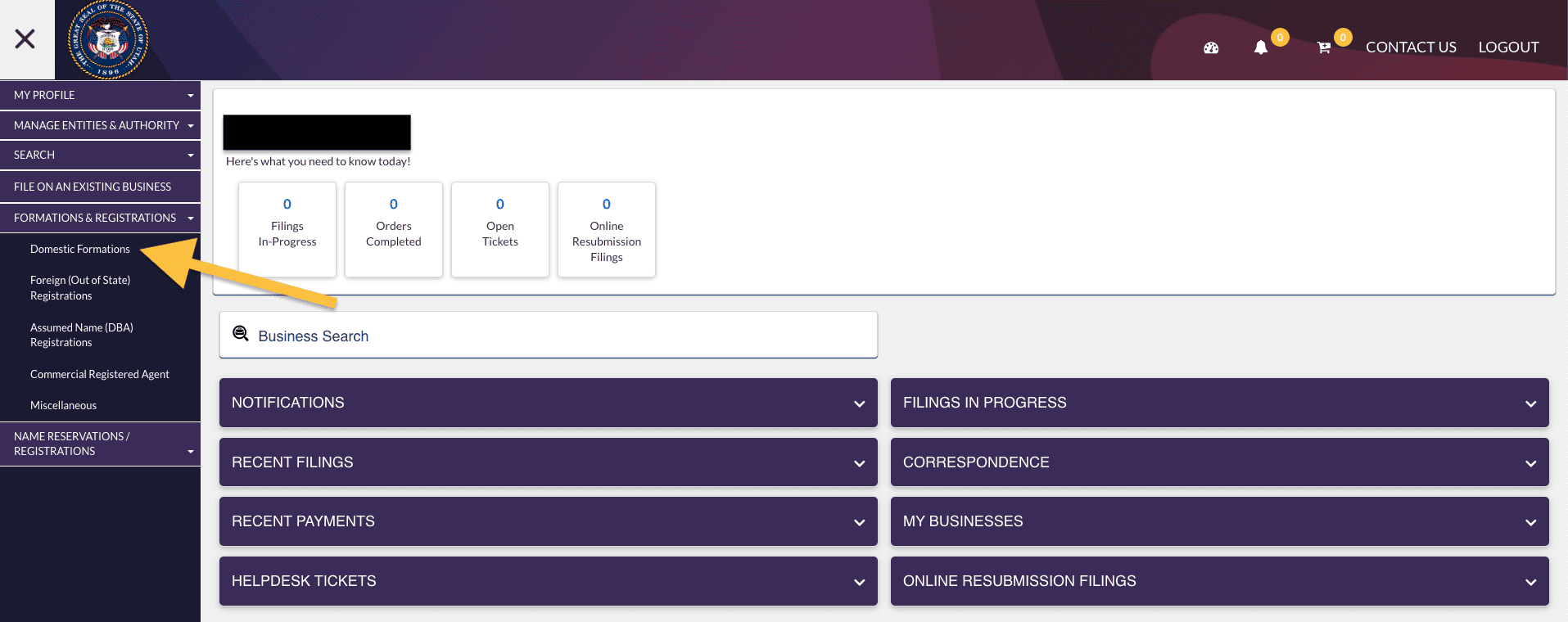 Once you’re logged in, click on “Formations & Registrations” in the left-hand menu.
